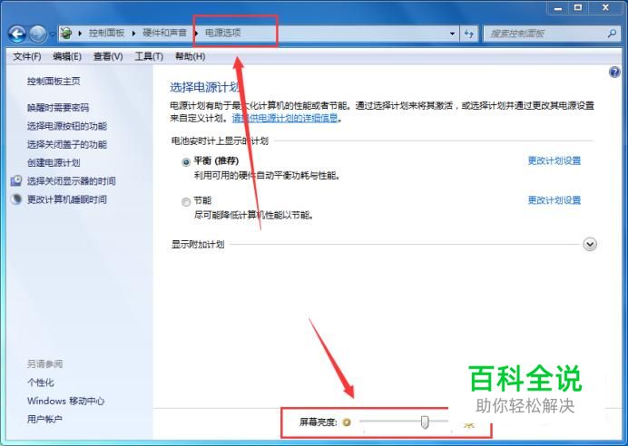 调节屏幕亮度 在弹出的【电源选项】窗口下方中,有【屏幕亮度】字样,移动砝码既可以调节屏幕的亮度,如下图所示: