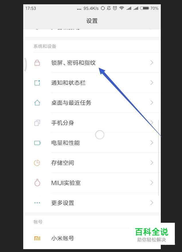 锁屏、密码和指纹 打开手机设置,在手机页面往上面拉,找到系统和设备中的锁屏、密码和指纹,点击进入。