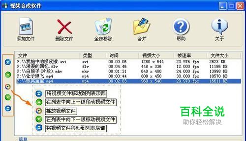 导入的视频文件会显示在列表区中,选中某一视频,在界面下方可以看到该视频的编码、比特率等参数信息,在界面左边有几个工具按钮,看下图注释,主要用来播放视频和调整指定文件的排列顺序的。