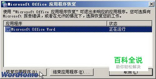 第2步,打开“Microsoft Office应用程序恢复”对话框,选中“应用程序”列表中无法响应的Word程序,并单击“恢复应用程序”按钮。