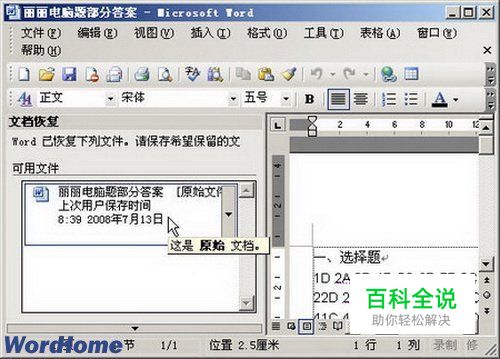 第3步,重新打开Word2003程序,在左窗格中将出现自动生成的Word恢复文件列表。单击选中需要恢复的文件即可打开。