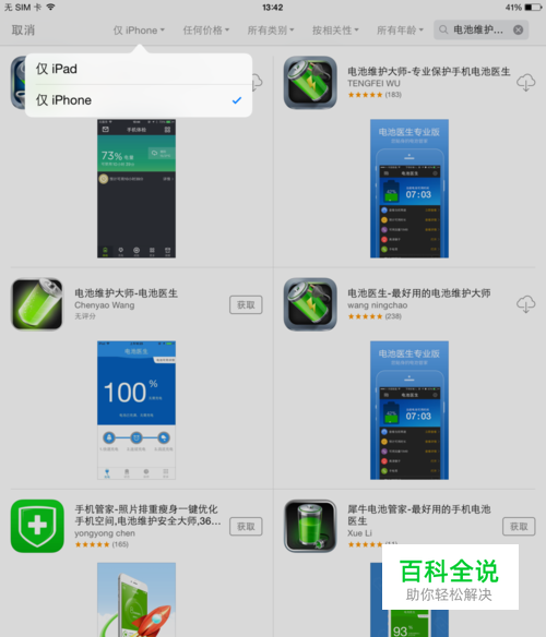 搜出来有很多同名的,其中“电池维护大师-专业保护手机电池医生”和“电池医生-最好用的电池维护大师”这2个都可以查询,其它虽同名但不可以查。 IPAD注意要在左上角选一下"仅iphone"才可以搜得出来。