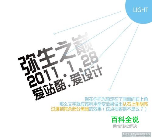 第一步:现在你把光源定在了画面的右下角,那么文字就应该利用渐变效果做成右下角明亮过渡到其余部分的黑暗的效果