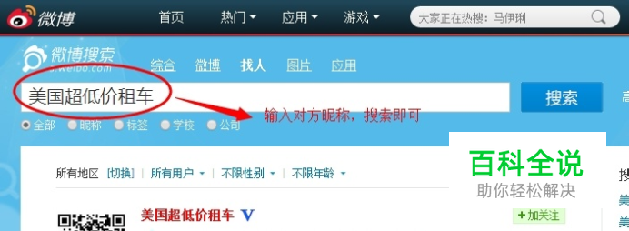 登录自己的微博帐号后,在搜素框里输入对方的昵称如“美国超低价租车”,下方就会显示所要找的微博,点击进去即可。