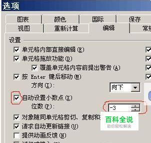 上图中,切换到“编辑”选项卡,然后,在“设置”那里,找到“自动设置小数点”,在其前面打上一个√勾;之后,在其后面的框中输入-3或自行设置成为其它数字,记住哦,是负的。 最后,点击“确定”按钮退出即可完成!
