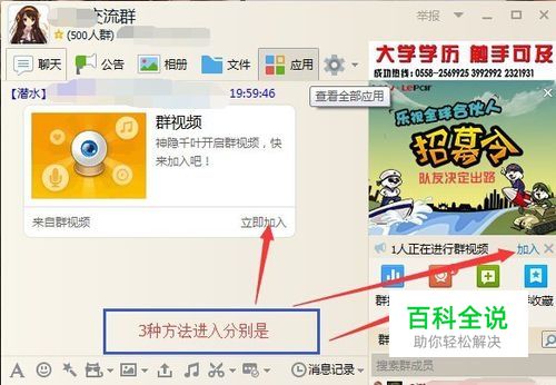 电脑端 如果群视频已经被别人开启了 我们有3种方法可以进入,分别点击聊天窗口上的别人名字下的加入链接,右侧“1人正在进行群视频”旁边的加入链接和群应用中的群视频按钮。