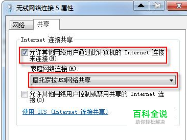 接下来请右键单击平时让电脑正常上网的那个网络适配器,通常为本地连接(如果你台式机)或是无线网络连接(如果是笔记本),接着点击“属性”按钮,切换到“共享”标签,勾选“允许其他网络用户通过此计算机的Internet连接来连接”,然后在“家庭网络连接”里选择刚才重命名的那个适配器,即“摩托罗拉USB网络共享”,最后点击确定即可