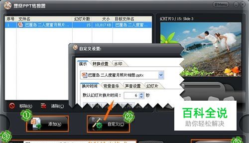 再使用转换器将PPT幻灯片转换成视频。 使用步骤:①添加PPT文件,②自定义,如添加背景音乐,③预置方案,即可提供多种的输出格式,④输出视频的保存路径,⑤开始PPT转换视频