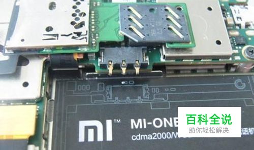 将手机螺丝卸下,拆壳,露出主板后,可以看到小米手机的电池连接器。(由于照片为补拍,所以电池座其中一个金手指的外壳被笔者损坏。)