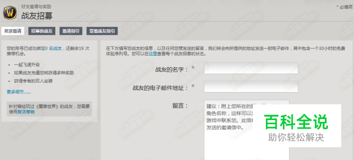 战友招募系统详细图文攻略 教你如何招募好友 为大家讲解国服战友招募系统的一些操作流程和细节以及需要注意的地方。 国服战友招募系统今天已经升级了,和以前的战友招募不一样的是,这次的战友招募不但会获得双人飞行火箭坐骑外,你和你招募的朋友一起任务打怪练级都会获得三倍经验,而且还能获得点卡奖励。 下面我们来介绍下战友招募中的一些细节,方便一些还没弄明白的朋友了解下整个战友招募系统的操作流程。 首先,在你要进行好友招募之前,你要注意几点问题: 1.你招募的好友必须有一个可以正常收取邮件的邮箱,这个邮箱可以是已经注册了战网通行证的或没有注册战网通行证的。 2.假如你的好友或家人还没有邮箱,你也可以使用你自己当前的战网通行证进行招募,当然你的这个战网通行证所对应的邮箱必须可以正常收取邮件。 3.当你的好友或家人通过被招募的邮箱里面的邮件连接激活帐号之后,系统会给你两个选择,一个是你有战网通行证帐号的情况,一个是你没有战网通行证的情况,当你通过被招募的邮箱地址登录战网通行证或注册战网通行证并登录之后,系统会自动在该战网通行证下新建一个试玩的帐号,该帐号有1800分钟的试玩游戏时间,在试玩期间同样享受三倍经验。 下面来介绍下如何进行好友招募: 首先登录你自己的战网通行证,选中你希望和你好友或家人一起游戏的帐号,进入帐号之后,在下面有一个“好友邀请与奖励”的选项,选中之后,下面就会出现“战友招募”的功能选项了,点击“战友招募”之后进入下面的页面: 该页面的“战友的名字”是填写你将要招募的这位好友或亲人的名字,下面的“电子邮件地址”是你将招募的好友或亲人的邮箱地址一定要填正确。 招募信息发送之后,你的好友或亲人将在你刚刚填写的邮箱里面收到一封由网易战网客服团队发送的邮件(一定要注意发件人的邮件地址,请认清是网易战网官方发送的,以防被骗),打开邮件之后,点击下图标记的“点击此处激活免费试玩!”。 当你的好友点击上面的激活链接之后,会进入网易战网进行相应的操作。下图为点击激活链接之后。 如果你招募好友的时候填写的邮件地址已经注册了战网通行证,那么就选继续登录,如果注册战网通行证,那就注册一个战网通行证。 进入战网通行证之后。系统会自动为你的好友创建一个新的魔兽世界帐号,如下图。 到这一步,关于战网的招募操作就结束了。 下面我们继续来给大家介绍下招募成功之后,在游戏里面的一些操作和功能以及需要注意的地方。 当招募成功之后,对方在你的好友列表的名字后面会有一个召唤的图标,这样就表示你和你的好友或亲人已经绑定成功,你可以使用该图标召唤你的好友到你的身边,你的好友也同样可以召唤你到他的身边,但是被召唤的那个人的等级不能超过4级。 当你们在组队打怪和做任务的时候,就会获得三倍经验了。获得三倍经验的条件是你们必须组队并且你们之间的距离必须在100码内,而且你们之间的等级差距不能超过4级,不管是谁。获得三倍经验的时候,在你的经验显示列表会多一个“+XXX点经验值的战友招募奖励”项,比如下图: 当你们组队并处于100码内的时候,交任务也会获得三倍经验,所以你们交任务的时候,应该等着大家在一起的时候一起交任务。比如下图的经验值,这个任务在没有三倍的情况下,经验为220,当获得战友招募的三倍经验之后,就变为660了。 战友招募还有一个“赠送等级”的功能。 赠送等级的要求: 1. 只对互相绑定的招募账号的角色对新手账号的角色进行奖励 2.必须在同阵营和同服务器 3.目标角色超过59级则不能获得等级奖励 4.不能奖励给相同等级或者更高等级的角色 5.绑定超过90天不能获得奖励 另外,每获得一个赠送等级,只有一次使用机会。例如:一个被招募角色有15个提升等级的机会,在他提升了招募他的老玩家账号下某新手角色10个等级,那么之后就只剩下五次提升等级的机会了。 当你招募的好友选择为你提升等级的时候,你的角色会显示一个确认框。 如果大家对招募系统还有什么不懂的问题可以到网易魔兽世界论坛提问。