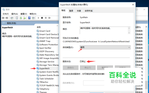 按Enter,进入“服务”,在服务列表里面找到Superfetch, 双击打开其属性,在服务状态点击“停止”,在“启动类型”选择“禁止”, 应用并确定,如图