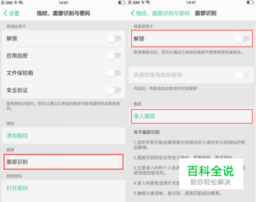 点击【面部识别】-打开【解锁】开关--【录入指纹】, 面部识别用于屏幕解锁。