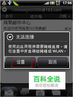 第二步:若您使用的是移动网络,页面出现无法连接的提示,请选择“设置”来开启移动网络。温馨提醒:移动网络的接入点需要设置为 cmnet ,接入点为cmwap无法正常收发邮件。(两种连接方式不同,资费也不同,详情请咨询当地运营商。)