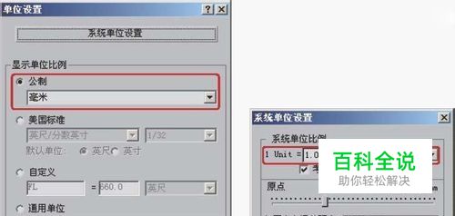 一.设置场景单位 执行菜单[自定义]|[单位设置]命令,设置[公制]为毫米,设置[1 Unit]的单位为毫米,如下图所示。单位设置完成后,即可将CAD图纸导入到3ds Max中,对齐三视图图纸。