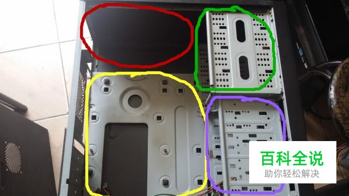 先把机箱前面板在右手边放倒,把向上一侧的盖板打开,红圈区域是电源位,黄色区域为主板位,绿色区域为光驱位,紫色区域为硬盘位。
