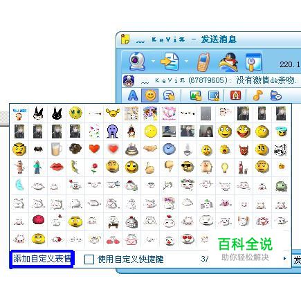 第三步:登陆上QQ,选择任意一位好友,打开聊天框,然后点选上面的那个笑脸的图标,然后点选“添加自定义表情”,如下图
