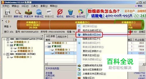 1、DiskGenius 磁盘分区工具的使用: ◆如果磁盘尚未分区,可以直接分区,本例中磁盘原已分区,则需先删除原有分区。首先删除最后一个分区(本例中E盘)。右键点击E盘,在下拉菜单中中选择“删除当前分区”;
