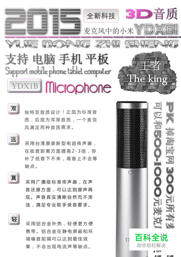 笔记本台式机电脑K歌如何搭配设备 电脑K歌录音常见配置;1音效声卡 、2电容麦克风、3监听耳机、4麦克风支架加K歌录音软件。 声卡作用; 放大麦克风声音,高清音质输出,处理各种音效和美化声音等等 麦克风作用; 录入声音,把信号转化成声音。 监听耳机作用; 监听伴奏,监听自己的声音。 麦克风支架作用;固定麦克风,防止震动。 A 、声卡配置经验;K歌声卡分为两种,一种是外置声卡(通过usb接口连接电脑),一种为内置声卡(通过电脑主板pci连接电脑)。笔记本电脑必须配置外置声卡,因为笔记本只能采用usb接口链接。台式机电脑搭配外置声卡和内置声卡都可以。 1、内置声卡;内置声卡在以前可以说功能强大,音效类型多,被普遍采用。但是兼容性和操作的复杂性往往让好多人头疼! 2、外置声卡;以前的外置声卡功能不行!只有几个混响功能,随着科技的发展,外置声卡可以媲美内置声卡的功能,而且在兼容性和操作性完胜内置声卡,可以说操作简单使用方便功能强大。是K歌的不错选择,推荐品牌;艾肯icon cube 、创新 、玛雅 、客所思 等等 B、麦克风配置经验;麦克风简单分为两种一种是电容式和动圈式。动圈多用于家庭影院不适 合电脑K歌,在这里不多说了。重点说一下电容麦克风。麦克风目前市场上可谓是五花八门,以次充好现象普遍。说不一定几十元购买的麦克风比几百元的音质好!说不一定购买个名牌产品,没有一个陌生的品牌几十元的音质!简单给大家分享几个鉴定技巧。 1、看麦克风指向性(录音方向);常见电脑麦克风有(全指向也叫无指向)和(心形指向) 因为使用电脑K歌录音K歌要注意,电脑周边噪音源比较多!比如散热风扇、硬盘声音、键盘声音、鼠标声音等 如今你选择(全指向也叫无指向)那就不是太好,因为这种录音指向是360度的,会把电脑周边噪音录制上!一定要选择(心形指向)这种麦克风就像晚上使用手电筒一样照到哪里录制哪里!可以杜绝电脑周边噪音源。 2、看传声器的直径大小和产地;麦克风主要配件是传声器,也叫音头和咪头。麦克风的音头大小和产地决定麦克风的好坏。而且麦克风音头的直径越大音质越好价格也越高,麦克风音头常见直径尺寸;9.7MM 14MM 16MM 22MM 25MM 32MM 。现在好多厂家为了利润,把麦克风外壳弄的很大,里面安装一个小音头欺骗消费者。所以大家购买时间一定要注意不要光看外观。第二看麦克风音头产地;目前高端麦克风音头主要产于美国、日本、台湾、韩国等在技术方面比较先进,不会出现低音下不来,高音上不去清晰度不够等等缺点。麦克风推荐品牌;舒尔、铁三角、MXL 、乐动之声等等 选择音频设备一定要选择适合自己的!!!!!!要不然唱歌都没有心情!!!!!!