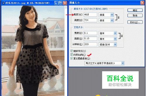 首先打开要处理的照片,根据图片像素大小和你的需求,调节图片的像素大小,本例中的图片大小为500×754,处理后要变为统一大小的480×600,首先就将图片的宽度调整为480,注意一定是要约束比例哦。见下图: