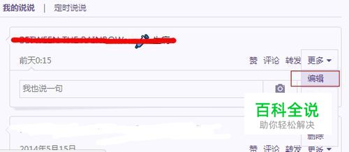 如果您是以前发表的说说,那么请你现在你的说说下找到您所要加密的说说,下面编者就随便找了一条。从笔者图右下方可以看到有【更多】下面有【编辑】这个选项,找到点击。