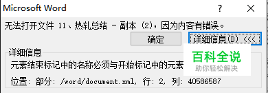有时候在打开word2010时会出现问题,显示“无法打开文件,因为内容有错误”,进一步打开详细信息,显示“元素结束标记中的名称必须与开始标记中的元素类型相匹配”。自带的修复不起作用、网上流传的Rebulider插件也不起作用(因为该插件是针对由于公式导致的错误,如果不是公式导致的就没法修复)。最终冥思苦想,采取了根据错误信息提示,在XML编辑器找到错误的数据范围,然后在用文本打开的XML文件中把错误除去的方法实现修复。