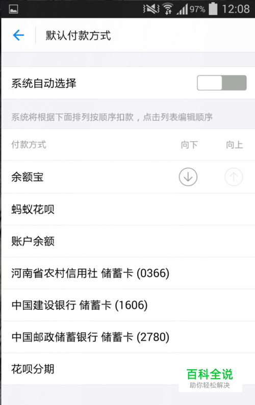 然后,点击余额宝后面的向上,调节箭头,将余额宝调至最上面,即设余额宝为首选支付方式。