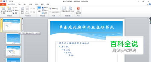 这时候幻灯片显示的是子版第一张,你要单击母版,即是左边第一张。