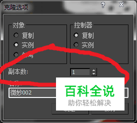 克隆选项的对话框中有各个选项,其中【复制】意思是当前的对象原位置复制一份,快捷键为Ctrl+V。【实例】是两个对象相关联,改变一个另一个也会改变