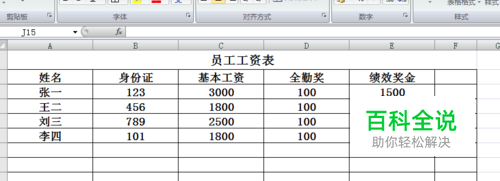 首先打开Excel,我们可以看到员工工资,比如按基本工作+全勤奖+绩效奖金算,如图所示。