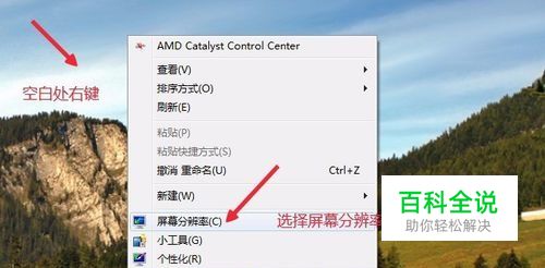 在电脑桌面点击右键,弹出桌面属性界面。Win7系统在属性中选择“屏幕分辨率”,XP系统选择属性下面的设置选项框。不同的系统版本会有不同,可以根据系统的版本选择你需要的项目。