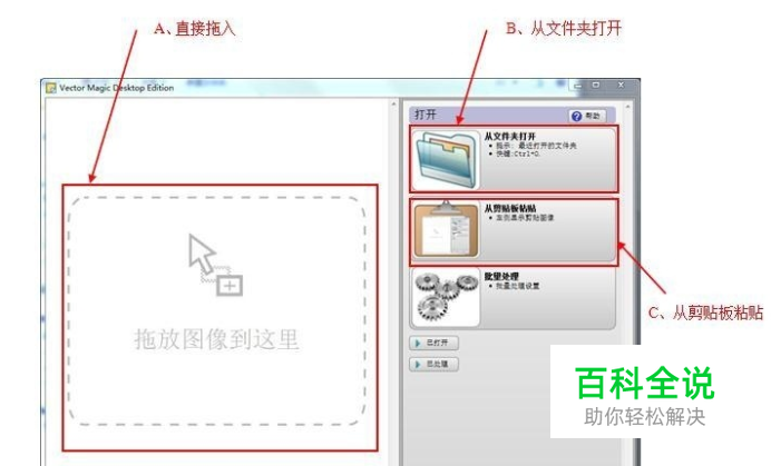 使用方法如下:1、启动程序,提供三种打开图片方式A、直接拖入 B、从文件夹打开 C、从剪贴板粘贴