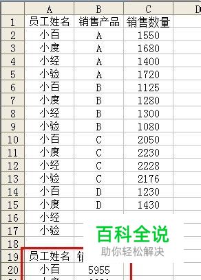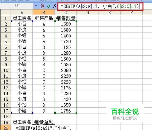 选择B20单元格,输入“=SUMIF(A$2:A$17,"小百",C$2:C$17)”。