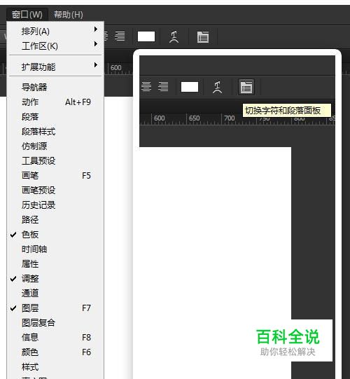 通常我们会在窗口菜单选择字符或段落面板,或者在文字工具选项栏点击切换字符和段落面板,来调用字符和段落面板。