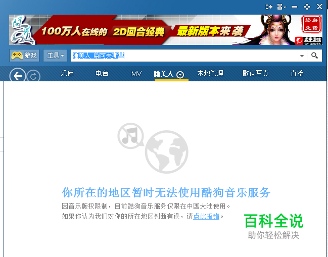1、首先,楼主在非大陆地区,在初初下载酷狗时,显示的版本是这样的: 2、 然后,搜索歌曲,显示的结果是这样的: 这种情况就是:可以下载歌曲,但是无法搜索到想要的歌曲。 3、怎样解决呢? 步骤一:关掉所有酷狗的进程。 步骤二:关掉所有网络连接: 步骤四:打开酷狗 步骤五:开启网络连接。 4、 接下来,就可以正常搜索音乐并下载啦! 结果一:搜索音乐: 结果二:在线听: 结果三:下载到本地: 如果各位尝试过以上方法后,酷狗还sb得说你的IP不在大陆,那么楼主还有最后一招: 打开酷狗的设置界面,点击代理设置选项卡,填写信息如下:有人会问楼主,那个地址啊端口啊,应该怎么获取呢?获取地址就在:http://proxy-list.org/en/index.php。 打开页面后,在如下位置选择IP的国家为CHINA,如图:点击Filter Proxy那个按钮,然后出来一堆备选地址:选一个working的填入酷狗的代理就好啦! 请注意,以上图第一个IP为例,58.242.249.31:23684 这个的意思是:酷狗的代理地址写: 58.242.249.31;代理端口号写: 23684。 如上算是功德圆满吧!如果诸位尝试后,还有bug,欢迎留言商讨!