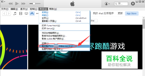 第一步首先打开苹果iTunes软件,在iTunes“商店”里面登录自己购买软件的Apple ID账户,账户登录完成后,点击显示账户。(如图)