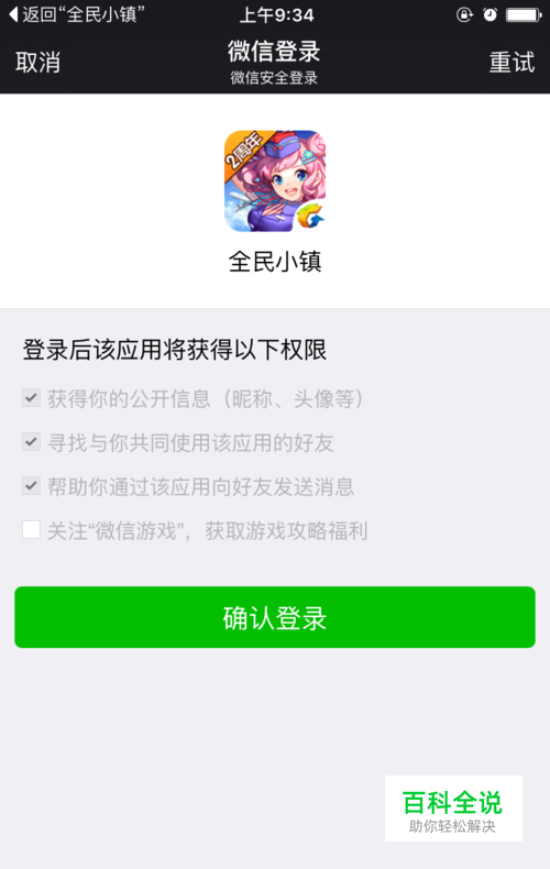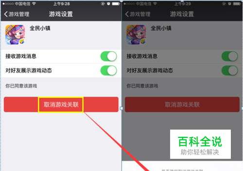 那么,问题来了,怎么取消之前的授权呢?很简单,点击对应的游戏图标,比如全民小镇,出现了下图所示的游戏设置页面,点击“取消游戏关联”,确认“取消游戏关联”