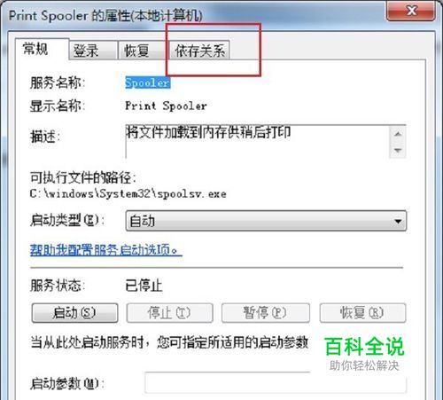 第二步点击确定,进去服务之后,找到print spooler服务,双击点击进去,选择“依存关系”,如下图所示: