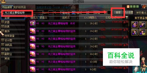 二、模糊搜索法 在拍卖行搜索栏,直接输入“卡片”,系统就默认出很多卡片,可以自己按要求点击需要了解的卡片。比如我点击“黄金巨人普拉塔尼的卡片”,就可以直接查看,或者选择购买。 这种方法,比较盲目性,主要适用于玩家对于附魔卡片的名字模棱两可,不能确定时,就可以用这种方法检索筛选;当然缺点就是所需时间较长。