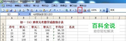 现在将平均分按降幂排序,以便决定名次。单击平均分所在列任意一个单元格,单击工具栏上的降序排序工具。