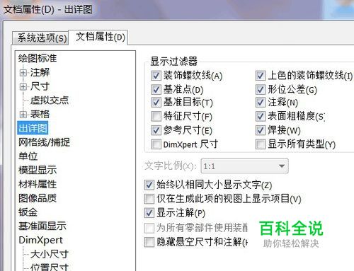 插入螺纹之前得先把“上色的螺纹装饰线命令打开”,否则插入了螺纹不会显示。打开文件菜单“工具”下拉菜单,选择“选项”,打开“文档属性”对话框,如图所示