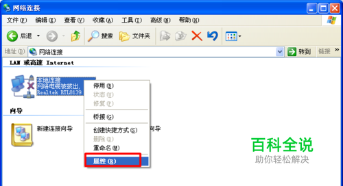 右击“本地连接”,从弹出的右键菜单中选择“属性”项。