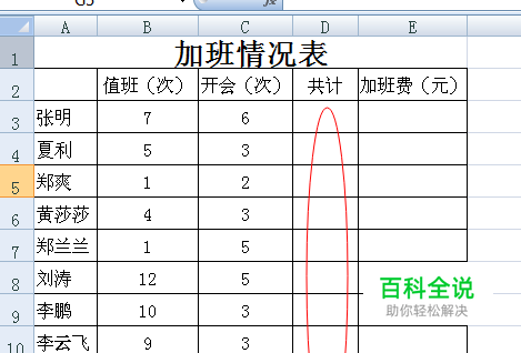 首先我们看到图中要计算,得到求和的单元格。我们知道共计的计算肯定是值班次数+开会的次数。