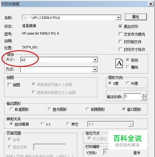 首先要确认打印文档或图纸时,是否选择了 正确的纸张大小; 如A3;