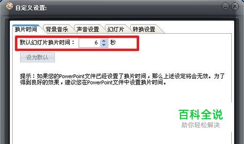 在PPT转换器设置“自定义”→“换片时间”里面,我们可以设定默认幻灯片换片时间的秒数,当然此设置有个提示就是只能对于那些原本PPT里面没有设置了换片时间才有效。