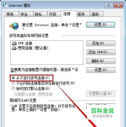 进入Internet属性对话框,再点击【连接】选项卡,再见点击下面的【从不进行拔号连接】最后点击应用。这样下次再上网就不会出现拨号连接对话框了。