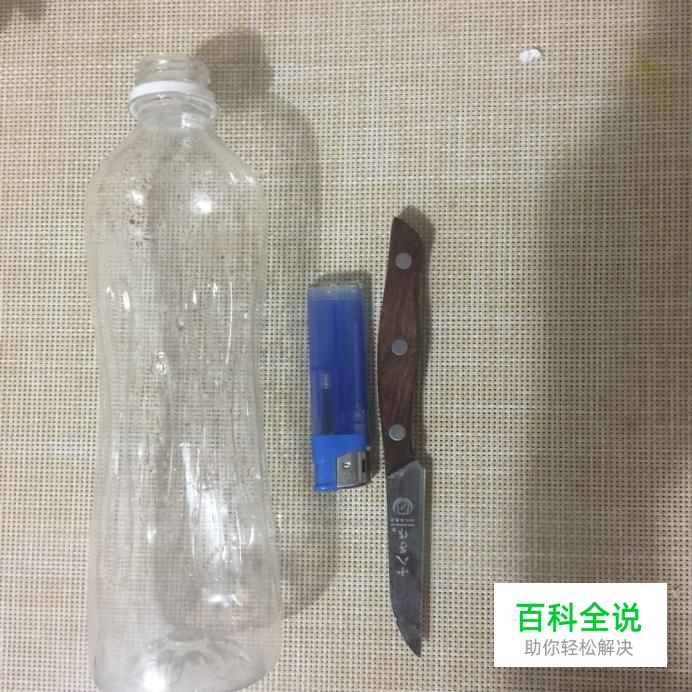 首先我们要准备一把刀,一个矿泉水瓶,一个打火机,如下图所示。