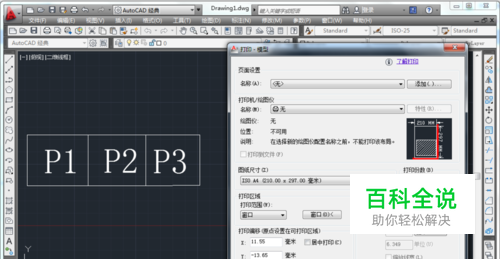 如图,在打开的AutoCAD软件中有三个待打印的图纸页面P1、P2、P3。 按下CTRL+P快捷键,弹出“打印-模型”对话框。