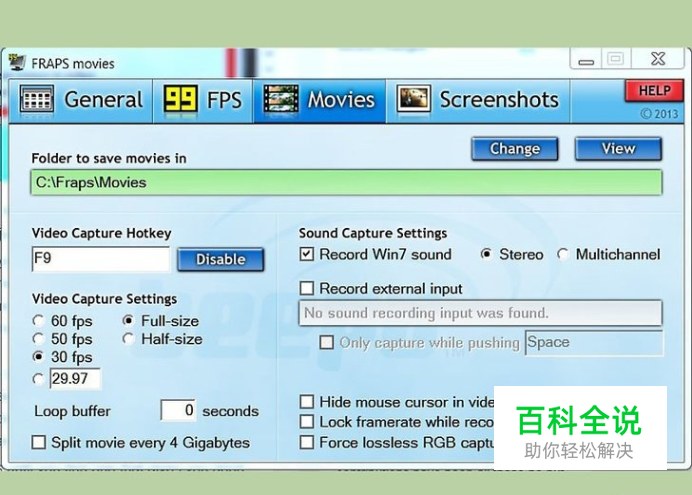 调整录像设置。点击视频(Movies)面板来设置 Fraps 录像参数。在该面板中,你可以对以下几个参数进行调整: 最顶端的选项用于选择保存录像文件的位置。点击更改(Change)按钮浏览定位一个新文件夹。 设置进行视频录制所使用的快捷键。默认快捷键是 F9。你可以在游戏中使用快捷键控制录制的开始和停止。 选择录制选项。Fraps 会对游戏性能显著下降,而且你所设置的录制 FPS(每秒帧数)越高,性能下降会越多。只有高性能的计算机才能够在很高的 FPS 设置下进行视频录制。 你可以尝试不同数值,直到找到数值能够保证游戏顺利,而且录制视频满意质量。 选择是否录制声音。如果你打算在发布视频中使用另外音轨,那么可以取消选择“Record sound(录制声音)”选项,这样可以减小录制生产文件的大小。