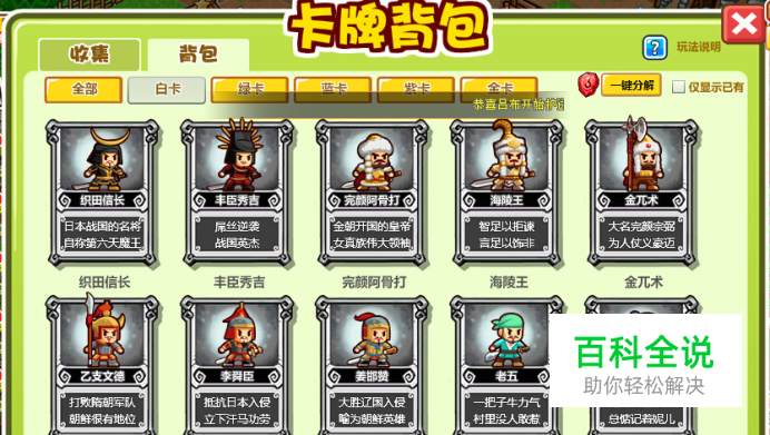 在村长打天下网页游戏里,武将也是优劣之分,而比较直观的区分方法,就是直接看武将的颜色品质。白色武将作为比较容易招募的武将,相信大家都招募了不少。那村长打天下白色武将有哪几个呢?村长打天下白色武将如何获得的呢? 村长打天下白色武将共有12个,分别有织田信长、丰臣秀吉、完颜阿骨打、海陵王、金兀术、乙支文德、李舜臣、姜邯赞、老五、旺财、狗剩、傻根儿。虽然这些白色武将的属性比较低,但是大家前期成长还是离不开这些白色武将的帮忙。不过,大家平时无需投入太多金币,去对这些白色武将进行升级。因为到了后期你都会想办法,将这些白色武将换掉的,就没必要浪费金币在这些白色武将上。 大家要想获得一些白色武将,就要通过村长打天下武将招募系统,抽取各种白色武将卡牌。当角色抽取到对应的白色武将卡片,就能直接拥有这些白色武将,而无需像之前那样额外花钻石购买啦。或者大家进入宝殿系统的将魂宝殿界面,使用将魂值兑换各种白色武将卡牌,这样也能快速获得各种白色武将。如果你将魂值不足,平时记得多完成护送使者任务,或分解一些多余的武将卡牌兑换将魂值。