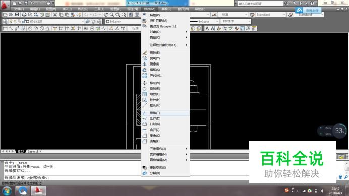 点击菜单栏中的“修改”键,再点击“修剪”键
